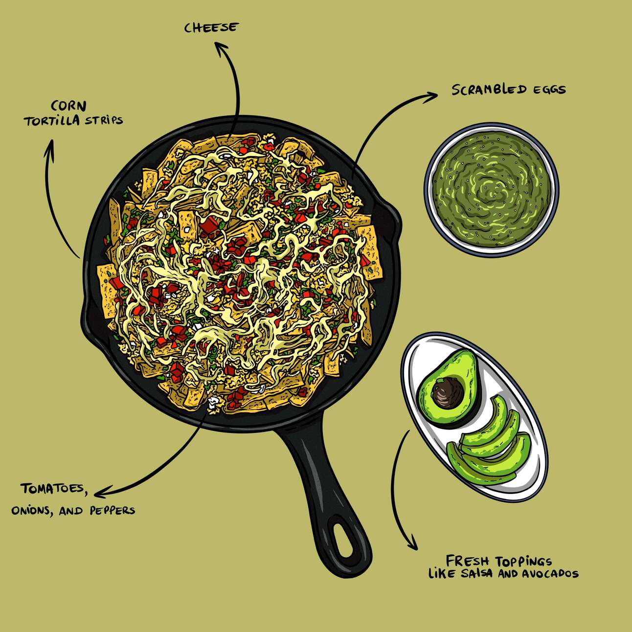 Make it your own: Eggs and corn tortilla products are essential, but vegetable or meat additions are welcome (try poblanos, chorizo, ham, etc). Serve on its own or as a filling for breakfast tacos. Bolster the meal with salsa and avocado, if you want.