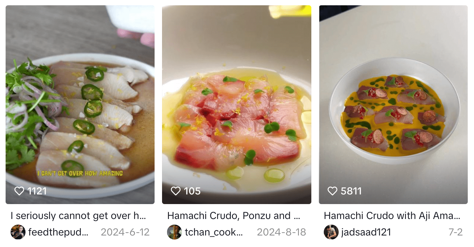 Hamachi crudo is also seen both as a foodie and light dining choice—flavorful but also lean, high in protein, and low in calories.