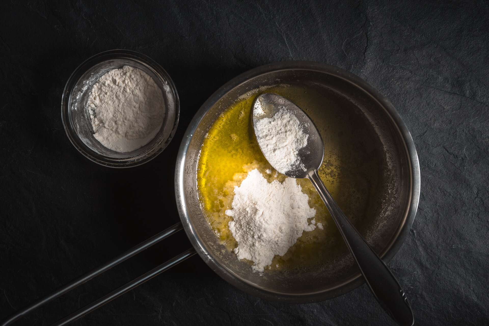 While equal parts flour and fat is a good starting point, making a roux isn't an exact science. It’s a forgiving technique. The chemistry behind how a roux works is what’s more important: the key is making sure each starch granule gets coated with oil, allowing it to disperse evenly in the broth rather than clumping together.