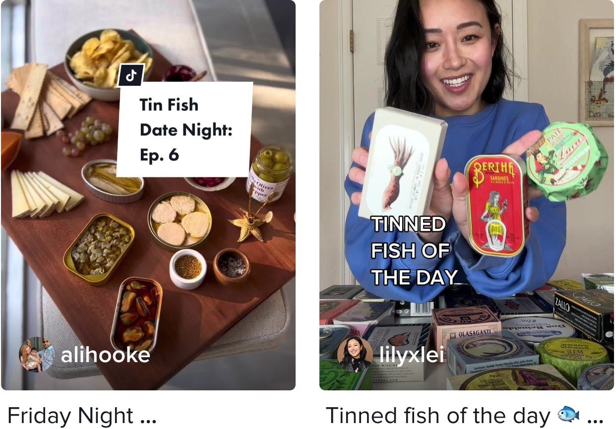 A: Tinned fish is indeed cool again — just check out the #seacuturie and #tinnedfish hashtags. Believe it or not, younger generations are even starting to make date night out of it.