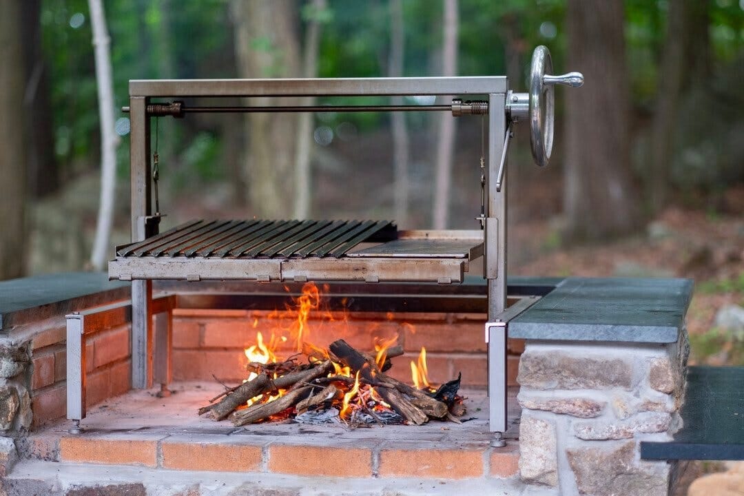 Argentinian grills have wide, metal bars that can be raised and lowered with a pulley system, usually heated by charcoal or wood fire.