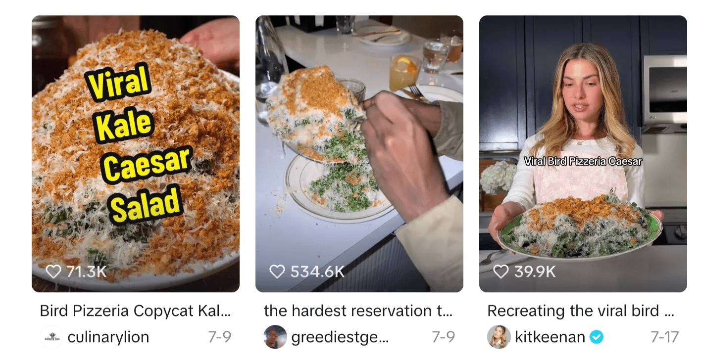 We’ve already covered why Caesar dressing is so satisfying, but Bird Pizzeria in Charlotte, NC is one of the many restaurants that are innovating on the other components of the dish. Their version swaps the large lettuce leaves for finely chopped kale, the croutons for breadcrumbs, and ramps up the parmesan with a blanket of micro-planed shavings (a trend of its own).